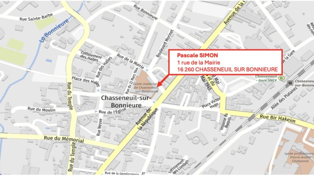 Adresse postale/sur GPS : 1 rue de la Mairie. 16 260 CHASSENEUIL SUR BONNIEURE